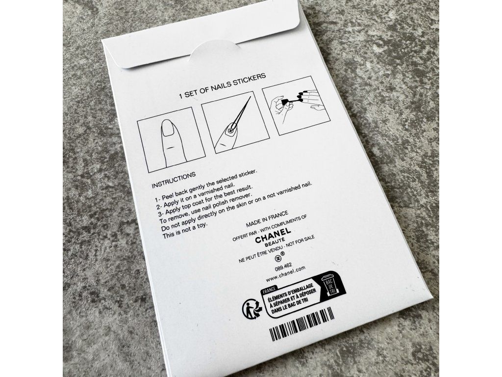 Aplikace je velmi snadná – samolepku stačí nalepit na lakovaný nehet a pro delší výdrž přetřít vrchním top coatem. Ideální pro oživení klasické manikúry nebo vytvoření jemného designu ve stylu CHANEL.